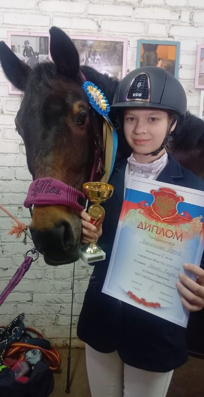 Предварительный приз –дети, тест А. Зачет для детей 2-ое место заняла Лимберис Евдокия на лошади Хива, с результатом 64,375 баллов (тренер Маркелова Елена Юрьевна);